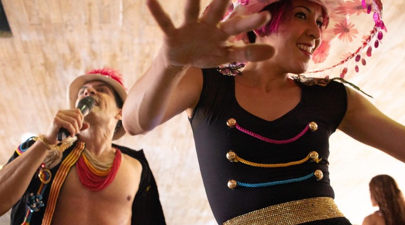 Um baile que lembra as “festas populares brasileiras” como “Forró ”, “Coco”, “Maracatu”, “Baque Virado”, “Ciranda”, “Boi”, entre outros. A ideia do publico se transformar em um “brincante contemporâneo” da cultura popular ao longo da apresentação. Tem como objetivo fazer o público dançar transformando estados físicos e emocionais através da vibração dos ritmos. O público experimenta estar em cena com os artistas, participando das coreografias, de forma inusitada, propondo uma interatividade dirigida que acontece em tempo real, com o objetivo de aproximar o publico do artista e do espetáculo, criando um encontro entre ambos. O público passa a ocupar um espaço ao lado do artista, participando, interagindo e refletindo. Foi realizada uma adaptação na sua criação para sua versão ON LINE, que só poderá ser concluída no dia de sua apresentação, pois esse formato necessita do publico para sua realização completa. A adaptação deste espetáculo continuou com o mesmo objetivo: fazer o publico participar do espetáculo, dançando, experimentando, assistindo e transformando estados físicos e emocionais através dos movimentos e da música. O público participa de casa, interagindo com as coreografias que serão propostas ao longo da apresentação, pretendendo construir uma nova forma de interação, especialmente para a condição ON LINE e esta, somente será possível ser realizada na pratica, ou seja, com a participação e presenta do publico, não sendo possível ensaiar uma interatividade sem a participação do seu protagonista: “o publico”. Os resultados desta apresentação serão uma surpresa para o publico e também para os artistas, somente neste dia iremos descobrir como essa relação interativa do espetáculo se estabelecerá ON LINE, pois não se trata de uma aula de dança, onde os passos são ensinados e repetidos por seus participantes. O público e os artistas, “juntos”, provavelmente, vão encontrar uma forma de participar, interagir e descobrir através desta relação “artista e publico” outras formas de construir uma interatividade, agora, na sua versão ON LINE. “Rolando a Ladeira”, “Nossa Senhora do Relax”, “Dona Lara vem Chegando” e “Nas Paradas do Sucesso”, são letras de músicas criadas especialmente para o “Bolo de Rolo: Banda Baile Bloco”, letras de autoria de “Ângelo Madureira” que nesta versão continuará tocando, dançando e cantando ao lado de sua parceira de trabalho “Ana Catarina Vieira”.